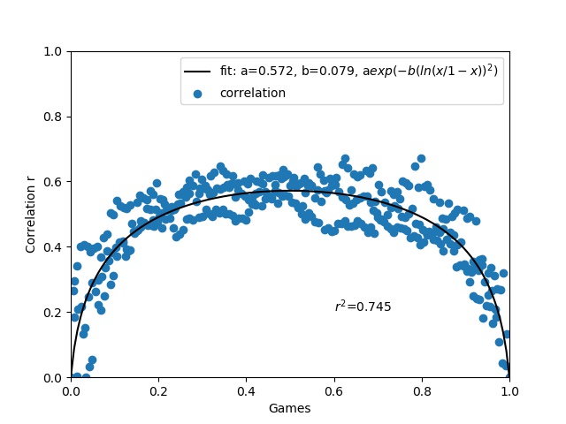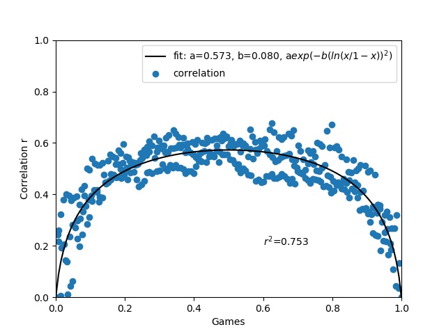 그렇다면 다시 돌고 돌아 아까 계산한 피어슨 상관 계수가 어떨지 궁금해집니다. 위에서 사용한 (현재 경기 수)/(시즌 경기 수)를 적용한 승률에 대해 남은 경기의 피타고리안 기대 승률을 계산해 보니 위에서 얻어낸 결과와 사실상 같은 결과를 얻을 수 있음을 확인했습니다. 제 생각에는 이러한 결과를 얻을 수 있었던 이유는 첫째, 결국 리그 평균 승률은 언제나 0.500이고 둘째, 시즌 초반 이후에는 나름의 승률 안정성을 얻기 때문에 중반 이후는 거의 피어슨 상관 계수의 변화가 없기 때문이 아닐까 싶습니다. 어떤 곳으로 가든 팀 승률의 예측성은 시즌 진행의 50%를 기준으로 대칭적인 모양을 보여주며, 저는 이 식을 실제 시뮬레이션에 활용하기로 했습니다.