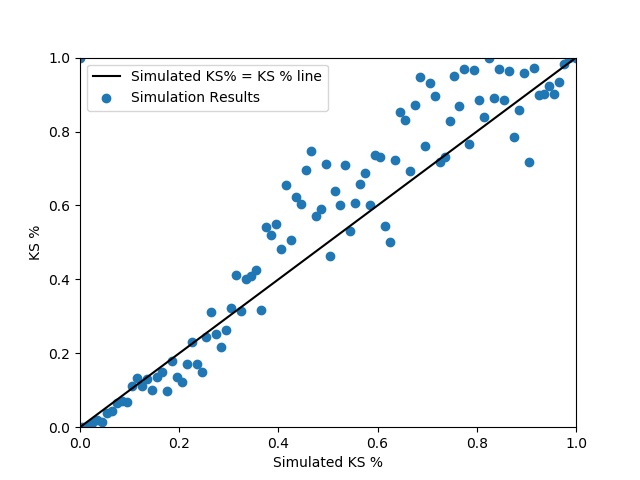 그렇다면 이제 다른 확률들도 알아보고 싶을 겁니다. KBO PS Odds 사이트는 PS 진출 확률뿐만 아니라 KS 직행 확률, PO 직행 확률, SP 직행 확률도 제공하니까요. 하지만 아직 그 결과가 얼마나 맞는지를 확인하긴 일러 보입니다. 일례로, Fig. 2는 PS Odds 사이트에서 제공하는 KS Odds를 Fig. 1과 똑같은 방식으로 그린 그래프입니다. 보시면 알겠지만 우리가 원하는 $W_{obs}=W_{sim}$ 선에서 좀 벗어나는 점들을 보실 수 있을 겁니다. 이는 PS 확률과는 달리 KS 확률은 만족할 만큼 많은 데이터를 얻기 힘들기 때문입니다. 정확히는 KS 진출 확률 10% 부근과 그 이하에 대한 데이터는 많이 얻을 수 있습니다. 왜냐 하면 시즌 시작 전 KS에 직행할 확률은 모든 팀이 공평하게 10% 일 것이니까요. 하지만 그 확률이 차차 올라갈수록 한 시즌에 그 정도를 성취할 팀들은 점점 적어지고 100%에 가까워지면 거의 모든 시즌이 한 팀이 될 겁니다. 그만큼 KS Odds가 높아질수록 얻을 수 있는 데이터가 적어지며, 그렇기에 KS Odds를 Fig. 1과 같이 처리할 수 없습니다. 아쉽지만 그 부분은 이 글에서 다룰 수 없습니다.
