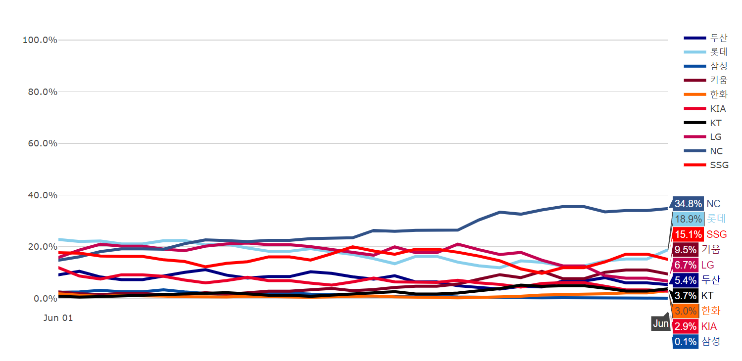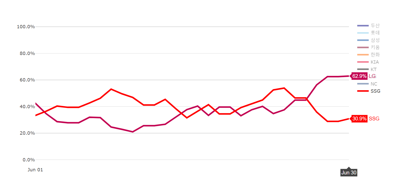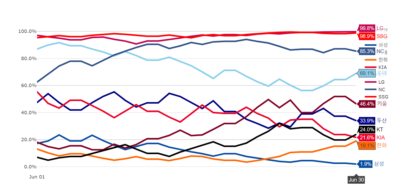 1. LG와 SSG가 1,2위를 다투면서 포스트시즌 진출 확률을 98% 이상으로 끌어올렸습니다. (각각 99.8%, 98.9%) 하지만 5월까지 3강을 공고히 하던 롯데가 추락하면서(9승 16패) 사실상 3위부터는 어떤 팀이 차지할지 알 수가 없는 상황이 됐습니다. NC가 6월 초반을 승승장구하며 롯데와 순위바꿈을 했지만 최근 페이스가 좋지 않고, 하위권으로 쳐져 있던 키움이 상승세를 타면서 5위로 뛰어올랐습니다. 그 외 두산, KIA의 페이스가 하락하였고 하위권에 있던 KT, 한화도 상승세를 타면서 어떤 팀이라도 포스트시즌을 노려 볼 수 있는 형세가 완성됐습니다.