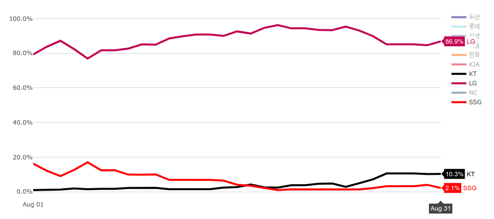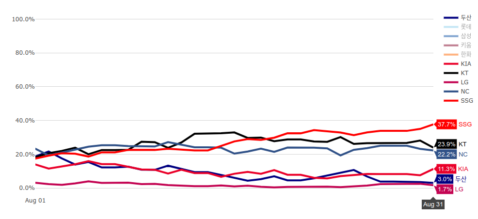 2. KT의 8월은 눈부셨습니다. WBC가 있는 해에 우승권 팀이 시즌 초반을 헤맸다는 점에서 2017년 두산이 생각납니다. 어쩌면 당시 두산보다도 더 힘들었던 상황이었습니다만, (KT는 6월에 포스트시즌 진출 확률 4.8%까지 경험한 바 있습니다.) 결국 우승을 노릴 수 있는 전력이라는 평가에 무색하지 않게 1위를 위협하는 무시무시한 팀이 되었습니다. 다만 8월의 승률이 0.826이었다는 의미는 그 정도의 승률을 유지하기 쉽지 않다는 의미이기도 하고, 아직도 LG와의 격차는 있기에(4.5경기 차) 1위 LG를 넘기는 쉽지 않아 보입니다. LG는 한 때 KS 직행 확률 96.3%까지 올라갔지만(8월 19일) 이후 연패를 거듭하면서 80%대 중반 정도의 직행 확률을 보여주고 있습니다. 2017년 KIA, 2019년 SK를 생각해 본다면 9월은 생각보다 힘든 싸움이 될 수 있습니다. 최대한 빠른 시일 내에 1위를 확정시키는 게 중요하다 할 수 있겠습니다.