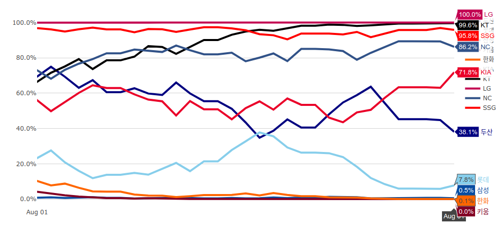 1위 LG(0.617/0.619/0.608/0.606/99.9%->100.0%): 최대한 빨리 1위를 굳히는 게 중요.