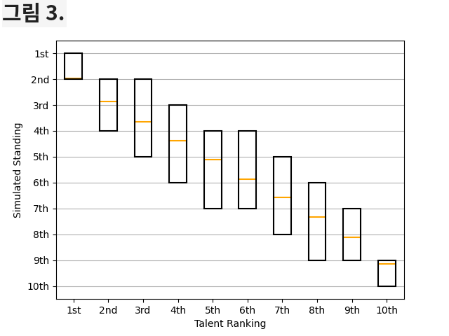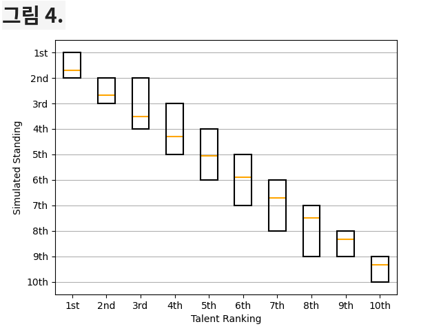 시뮬레이션된 KBO의 평균 시즌 팀 승률 표준편차는 0.075 정도입니다. KBL은? 0.139 정도입니다. 위의 그림 1. 과 그림 2. 에서 보듯이 KBL에서의 팀 간 재능의 격차가 더 크기에 당연한 결과입니다. 그렇다면 평균적으로 재능이 가장 우수한 팀이 실제 정규시즌 우승을 할 확률은 얼마나 될까요? KBO는 52.45%이고 KBL은 62.24%입니다. KBL의 재능 1위 팀의 우승 확률이 KBO에 비해 약 10% 가량 높습니다. KBO 재능 1위 팀의 평균 순위는 2.00위, KBL 재능 1위 팀의 평균 순위는 1.72위입니다. 그림 3. 과 그림 4. 를 보면 두 시뮬레이션 결과의 차이를 알 수 있는데, 전체적으로 KBO의 시뮬레이션에서 계산된 각 팀별 순위의 범위가 KBL의 시뮬레이션 결과보다 큰 편입니다.