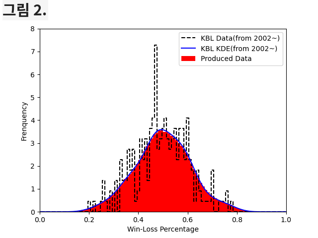 KBO는 2000 시즌 부터의 KBO 기대 승률을 통해 뽑은 50000 시즌의 팀 승률 분포를 이용하였습니다. (그림 1) KBL은 2001-02 시즌 부터의 KBL 기대 승률을 통해 뽑은 50000 시즌의 팀 승률 분포를 이용하여 뽑았습니다. (그림 2) 각 그림에서 알 수 있듯이, KBO는 KBL에 비해 팀간 재능의 격차가 크지 않습니다. 그렇기에 팀별 격차가 시즌 순위의 정확성을 비교할 때 경기 수만큼 중요한 키가 될 수 있습니다. (좀 더 시뮬레이션 절차를 알고 싶으신 분들은 시뮬레이션 방법 글을 참조하세요.)