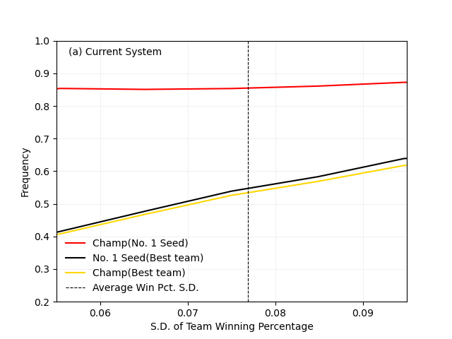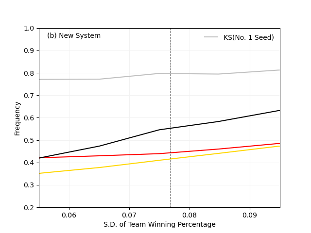 그림 1.에서 (a)는 현재 포스트시즌 제도를, (b)는 이전 글(KBO 포스트시즌 - 늘어지는 일정을 과감히 단축하자.)에서 제안한 포스트시즌 안을 수용했을 때 결과를 의미합니다. 그래프에서 x축은 시즌 팀 간 승률 편차를, y축은 빈도를 의미합니다. 그리고 검은 선은 재능 1위 팀의 정규시즌 우승 확률을, 붉은 선은 정규시즌 1위 팀의 KS 우승 확률을, 노란 선은 재능 1위 팀의 KS 우승 확률, 은색 선은 포스트시즌 제도 변화가 생겼을 때 정규 시즌 1위 팀의 KS 진출 확률을, 마지막으로 검은 점선은 평균적인 시즌 팀 간 승률 편차를 의미합니다. 어차피 포스트시즌 제도가 변화됐든 아니든 정규시즌 구조가 변화한 것은 아니기 때문에 평균적인 표준 편차는 크게 달라지지 않을 것입니다. (평균 0.077) 그렇기 때문에 평균적인 재능 1위 팀의 정규시즌 우승 확률(a는 53.17%로, b는 53.34%로 계산됐습니다.)이나 승률 표준편차에 따른 재능 1위 팀의 정규시즌 우승 확률 변화 양상도 같을 겁니다. 두 경우에서 아주 크게 차이 나는 것은 정규시즌 우승팀의 KS 우승 확률로, (a)는 85.63%, (b)는 44.92%로 거의 두 배 차이가 납니다. 아무래도 1위 팀이 준결승에서부터 시작하는 것과 KS에서 시작(+체력적 우위를 상정한 계산)은 차이가 큰 법입니다. 그렇다면 재능 1위 팀 간 우승 확률은 차이도 앞에서처럼 거의 두 배가 날까요? 결과는 '아니요!'입니다. (a)에서 재능 1위 팀의 우승 확률은 51.86%, (b)는 41.20%로 계산됐습니다. 10% 정도의 차이로, 40%나 차이가 나던 정규 시즌 우승 팀의 KS 우승 확률에 비하면 격차가 많이 작습니다. 이는 아무래도 재능 1위 팀이 정규시즌 우승할 확률이 생각보다 낮기 때문에 나타나는 현상이라고 생각해야 할 겁니다. 현재 PS 제도는 정규시즌 1위를 하지 못한 재능 1위 팀이 우승할 확률이 (b)에 비해 많이 낮고, 이 때문에 (a)와 (b)에서의 차이가 정규 시즌 우승 팀의 KS 우승 확률만큼 나지 않는 이유가 될 겁니다.