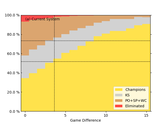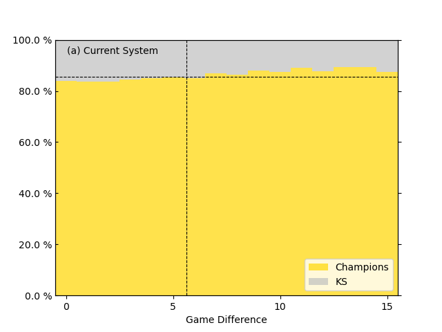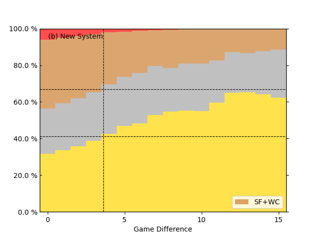 그림 3.은 재능 1위 팀과 재능 2위 팀의 팀 간 격차에 따른 재능 1위 팀의 포스트시즌 결과를 그린 그래프입니다. 전체적인 내용은 비슷한데 이 경우 재능 1위 팀이 정규 시즌 1위와 같지 않기 때문에 포스트시즌에 진출하여 KS에 못 간 경우와 아예 포스트시즌에 진출하지 못한 경우도 경우의 수에 넣어야 합니다. 또한 x축의 내용도 살짝 다른데, 그림 3. 의 x축은 시뮬레이션 결과 정규 시즌 1위 팀과 2위 팀의 경기 차가 아니라 시뮬레이션에 넣기 전 재능 1위 팀과 재능 2위 팀의 기대 승률 격차를 경기 차로 치환한 값입니다. 그리고 그 격차가 양자화 되지 않기 때문에(예를 들면 0.550 팀과 0.500 팀의 평균 기대 승차는 7.2경기입니다.) 0~1경기 차면 0에 해당하는 빈(bin), 1~2경기 차는 1에 해당하는 빈에 넣는 식으로 빈을 만들어 그린 그래프입니다. 위 그래프를 보면 두 제도 다 재능 격차가 커질수록 평균적인 우승 확률이 높아지는 걸 확인할 수 있지만, 그 격차가 현재 포스트시즌 제도에서 더 크다는 걸 알 수 있습니다. 이는 재능 격차가 커질수록 정규시즌 우승 확률 또한 커지기 때문에 나타나는 현상입니다. 이는 팀 간 승률 격차와도 다른 효과로, 1-2위 팀 간 격차만 생각했을 때를 그린 그래프이기 때문입니다. 그렇기에 재능 격차가 아주 많이 커질 경우 현재 포스트시즌 제도에서 1위 팀이 우승할 확률이 제안한 포스트시즌 안을 채택했을 때에 비해 더 드라마틱하게 달라지게 됩니다. 하지만 재능 1위 팀과 2위 팀 간의 차이가 1경기 이내일 경우처럼 그 차이가 크지 않을 경우 두 제도 간의 차이는 그리 크지 않습니다. (a 우승 확률: 34.44%, b 우승 확률: 31.77%)